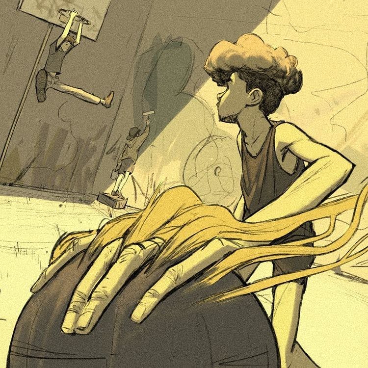 Daniel Hincapie, being an introspective buddy: It is an assortment of varying ranges. It starts with a random doodle, a thought, or a memory. If that idea keeps circling in my head, then I know I have to do it.